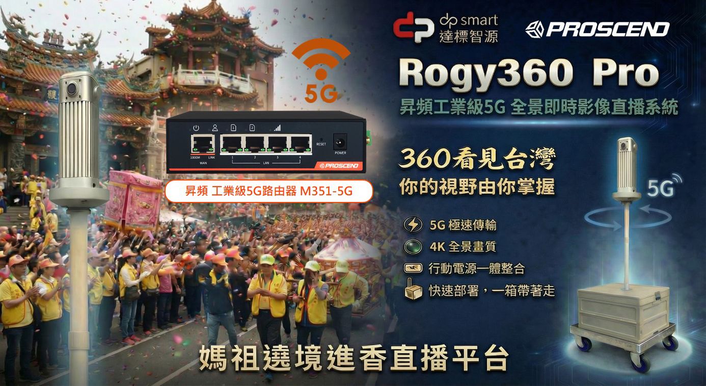 08 Apr, 2026工業物聯網行動通訊設備台灣領導廠商昇頻(PROSCEND),具備深厚的5G智慧連網技術與邊緣通訊整合實力,攜手全景直播影像專家達標智源,共創5G行動直播應用生態系。透過Rogy360 Pro 5G全景即時影像直播系統,自4月12日起實境轉播全台規模最大、最具指標性的「粉紅超跑」媽祖遶境活動,在高密度人流與長距離移動場域中,全面展現即時影像傳輸的穩定性與行動通訊的強韌性。